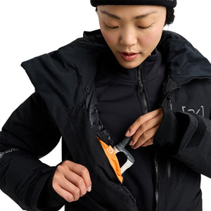 Down heat meets proven storm protection to make snowboarding's highest performance puffy. Period. The women's Burton [ak] Flare GORE-TEX 2L Down Jacket is your golden ticket for staying warm, dry, and riding longer. GORE-TEX keeps the elements at bay while letting your body breathe. Strategically placed insulation and a shaped fit warm your core and let you move without restriction. When the storm ramps up, cinch the neck to match your clava for heat-sealing warmth, and keep on riding.